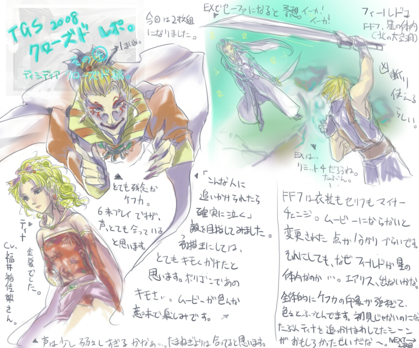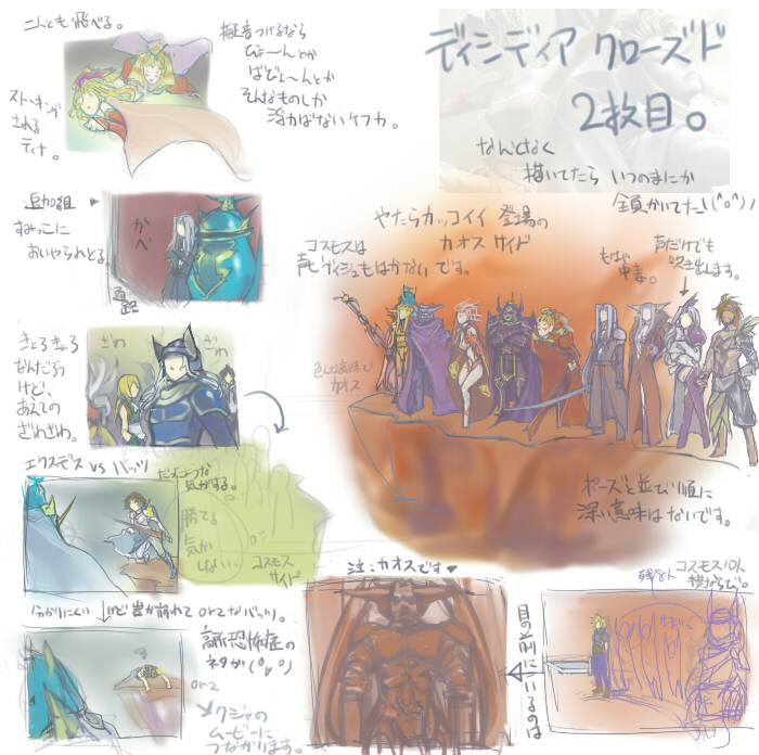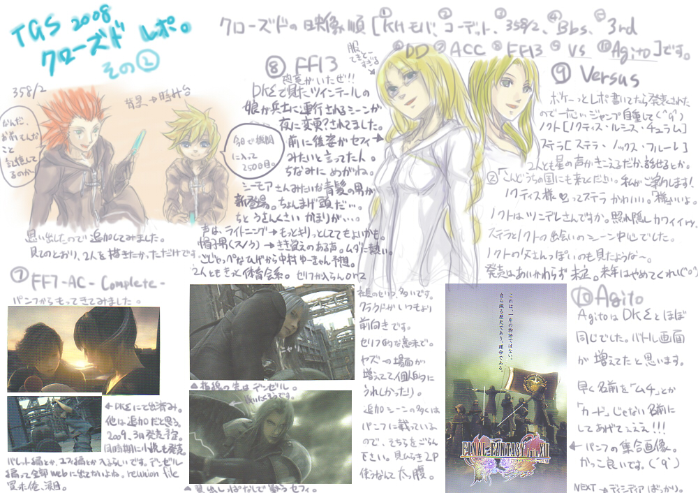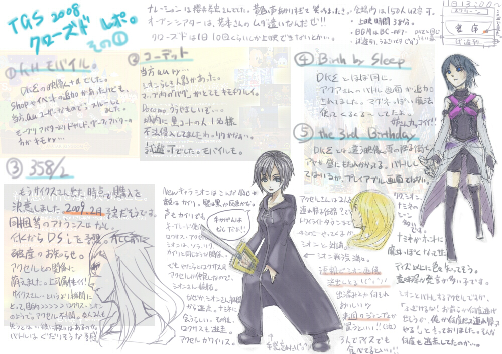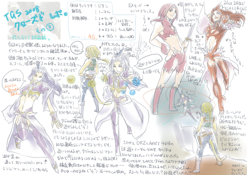 × [PR]上記の広告は3ヶ月以上新規記事投稿のないブログに表示されています。新しい記事を書く事で広告が消えます。 うえ(つд`)起きたら14時だったよママン。 授業もうおわっとるがな\(^o^)/オワタ まぁ1回くらい休んでも何とかなるのが 大学の良いところでもあり悪いところでも・・・もごもご 今回はクローズドのディシディアレポです。 何を思ったのかカオス全員描きました。アホすぎる。 コスモスサイドは場所的な問題で省略(苦笑) カオスはこんなにマジンガーZ風味ではないです。 もっとロゴのイラストに近い・・・というかロゴのまんまだったな コスモスはファミ通.comで画像出てたから 描かなくて良くね?と思いまして。潔く描くのを諦めました。 余白が多いレポですみません。 でも絵にしたから書く事がない。 2枚目のレポのちまい絵はムービー順に並んでます。たぶん。 カオスの横にクジャでも描こうかと思ったけど 最近描きすぎだなと思ったので自粛しました。 次はVPだ。あとACCの追記。 以下妄想\(^o^)/ ウォーリアとスコールって一緒にいるカットが多いような気がするんだが・・・戦う割には仲良いな。 玉ねぎはティナと話してそう。 ジタンはティーダと仲良しだといい!フリオとも話してたね。 バッツとセシルは話せるんじゃないか。何となく。 クラウドはきっと一人(´ρ`)カワイソス。スコールでもとっ捕まえて無言会議でもすればいい。 セフィロスは何気に他の人と話してるシーンがありますゆえ、独りじゃ・・・ない(笑) ガーランドだったかゴルベーザだったかな・・・ クジャは思いっきり独り演説してると予想。誰か相手してあげてください(笑) 前回のレポはもうTGSレポじゃなく見事にクジャレポでしたね。 病気すぐる自分orz 眠すぎてこんなどうでもいい妄想しか浮かびません。 だめだこいつ早く何とかry PR 今回も汚い絵と字をお楽しみください(笑) クローズドその①です。 まだKH+3rdだけorz 恐らくあと2枚くらいクローズドのヤツは書かねばなるまいよ。 試遊は1枚で間に合うか・・・ こっからはグダリます。かなりグダります。絵とか溶けてそう。 背景にうっすら使っている画像はスクエニブースで配布されたパンフの一部です。 届くまで1月もかかるもんね。目を凝らして見て下しあ(´ρ`) サントリー画像流出させすぎだよな~ もう全員分の野村氏イラ見ちまったよ。 FF9缶とFF7缶と~クジャのムービー缶を買いたいと思いまする。 問題は・・・確かこの3つとも同じ味だったような・・・ry 違うなら良いんだ。違うなら・・・ あぁ、また原寸が大きすぎて転送に失敗したorz これでも縮小かけてます。どうするべきか・・・。 |